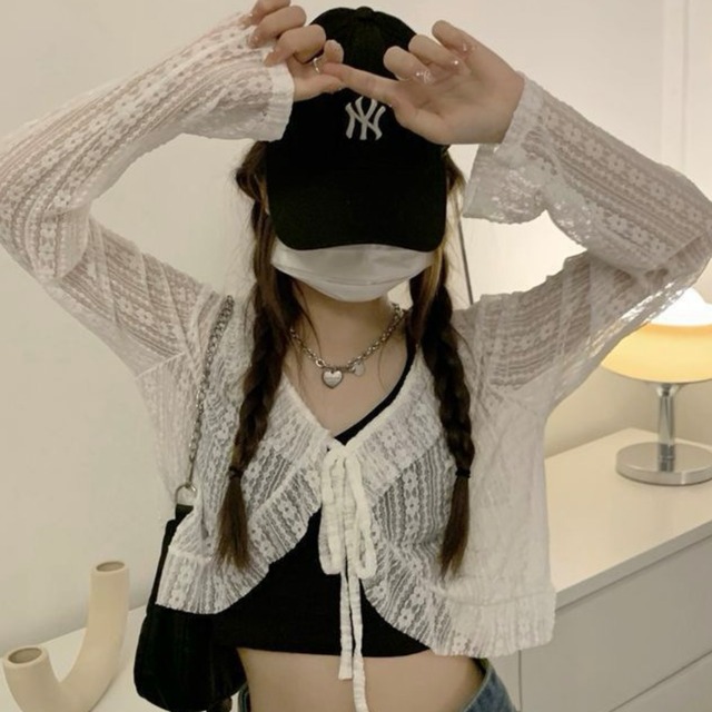 繊細なレースを使ったかわいらしいカーディガン。 フロントのフリルデザインがふんわりと優しい印象をプラスしてくれます。 花柄やスカート合わせでフェミニンにまとめるのはもちろん、 キャミソールやデニムパンツ、スニーカー合わせで韓国っぽカジュアルに仕上げるのもおすすめ。 レースで薄手なのでかさばらずに持ち運びできるのも嬉しいポイントです! 【カラー】 ホワイト / ブラック 【サイズ】 身幅:43 肩幅:36 着丈:35 袖丈:51.5 【素材】 ポリエステル100% ___________________________________ ※モニター・環境等により実際の商品と色味が異なって見える場合がございます。 あらかじめご了承ください。 ※海外輸入品のため、商品の入荷時期によって色合いや生地、細部の仕様に若干の違いが生じる場合がございます。 (DR0038)