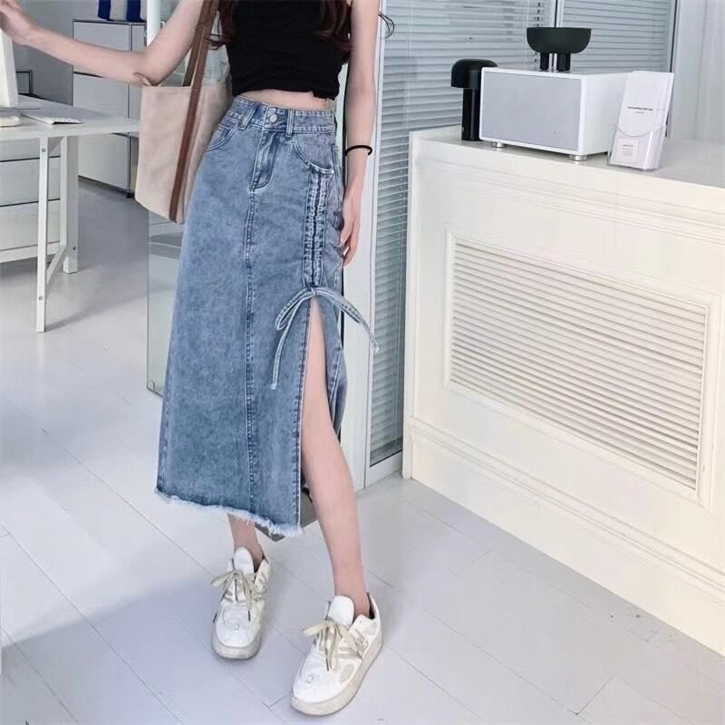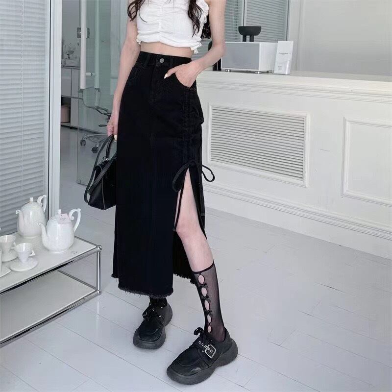 片側のフロントは膝上までのスリット入りで、動きやすさとほどよい抜け感をプラス。