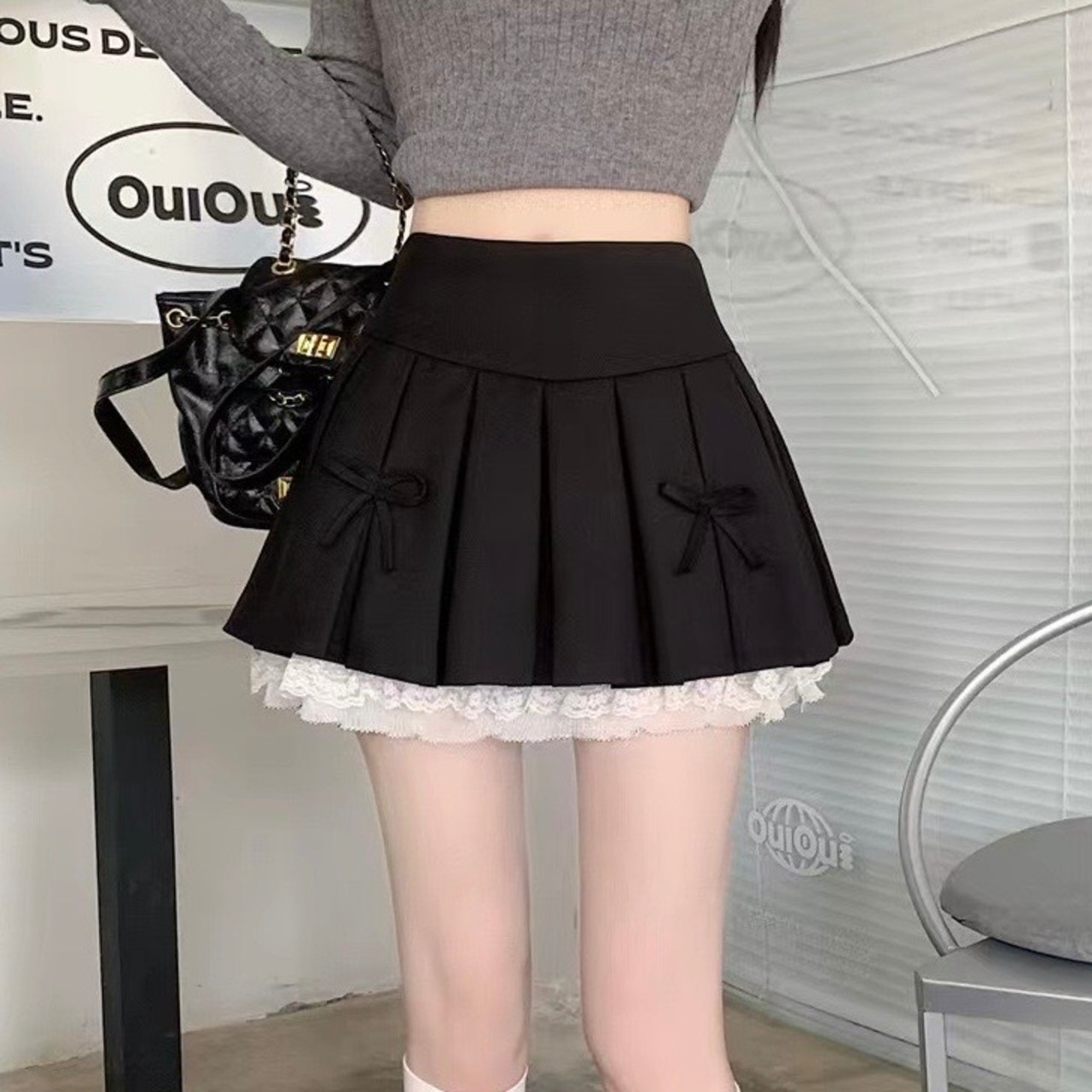 裾から覗くレースがかわいいボックスプリーツスカート。